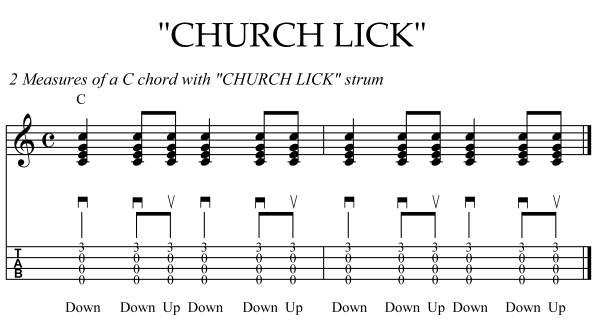 In designing this tutorial on COLORS OF THE WIND I chose to use “CHURCH LICK” as the basic strumming pattern for the ukulele. I’m not really sure how it got that name, perhaps you might know. . . But I do know it goes back to the early days of the Carter Famly and the folk music renaissance of the 60’s. Below I’ve inserted a graphic of the CHURCH LICK strum pattern to help you more clearly understand how it is played.