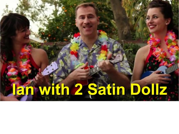 IAN: When we started doing “Bring Me Sunshine” on stage it was immediately popular. The message of the song so suited the uke. We had the Hollywood dancers the Satin Dollz on our tour with us in the UK for their first time. It was in the freezing snow last November (they’d never seen snow). They loved “Bring Me Sunshine” and wanted to learn it. I took them to Denmark St. near Soho before a gig at the 100 Club and they all bought ukes. That night they surprised me when they all came on stage surrounding me with their uke props and in their Betty Grable bathing suits. So . . . then I had to teach them.