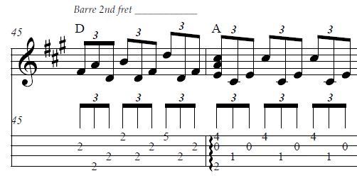 Below is an example, however, when the arrangement calls for an alternate or inverted position for a standard chord. In this case the D major chord. It requires the technique of barring to achieve this. This is a very good reason why it’s important to acquire the skill of barring.