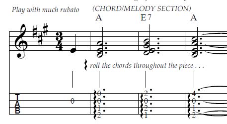 Note that in most tablature arrangements but simply following the chord indications given above will most often set up the left hand fingers for the notes to be played. Often one only needs to add a finger or move a finger up and down to grab the notes needed for the melody.