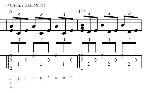 The 2nd section is a standard 8th note fingerpicking pattern. Middle finger or m plays the 1st string. Index finger or I plays the 2nd string. Thumb or p plays the 3rd and 4th strings. The melody can vary generally from first string to second string. On occasion the melody can be on the 3rd string, in which case it is played by the thumb.