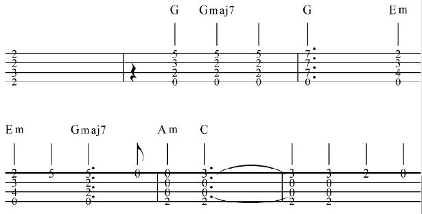 I have provided a full tablature arrangement of Sibelius and below are two small examples of the tablature.