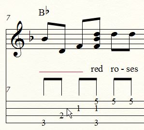 The C#6 chord is used in this piece. Do not be put off by the name. It’s actually a very simple chord. Merely barre the first 4 strings at the 1st fret. Remember the C6 chord is just the 4 strings played open, so barring it up one fret changes it to a C#6 chord. Notice all of the “1s” in the tablature clip before. Those are all held down as a barre chord at the first fret.