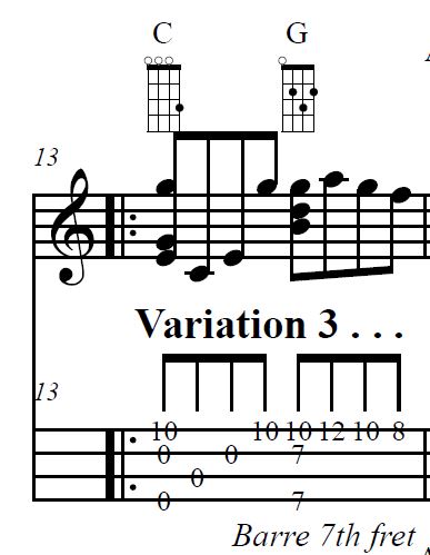 The Pachelbel Canon is basically made up of merely 2 measures. Those measure with their accompanying chord progression repeat with melodic variations. However, since the melody moves up the fingerboard the chords need to move too. This is where chord inversions come in handy. Most basic chords are made up of 3 notes. The order in which those notes are positioned depends on the melody part. Look at the clip below and notice the G major chord. You need to barre the 7th fret while the pinky plays the 10th fret 1st string to make this chord work in its high inversion.