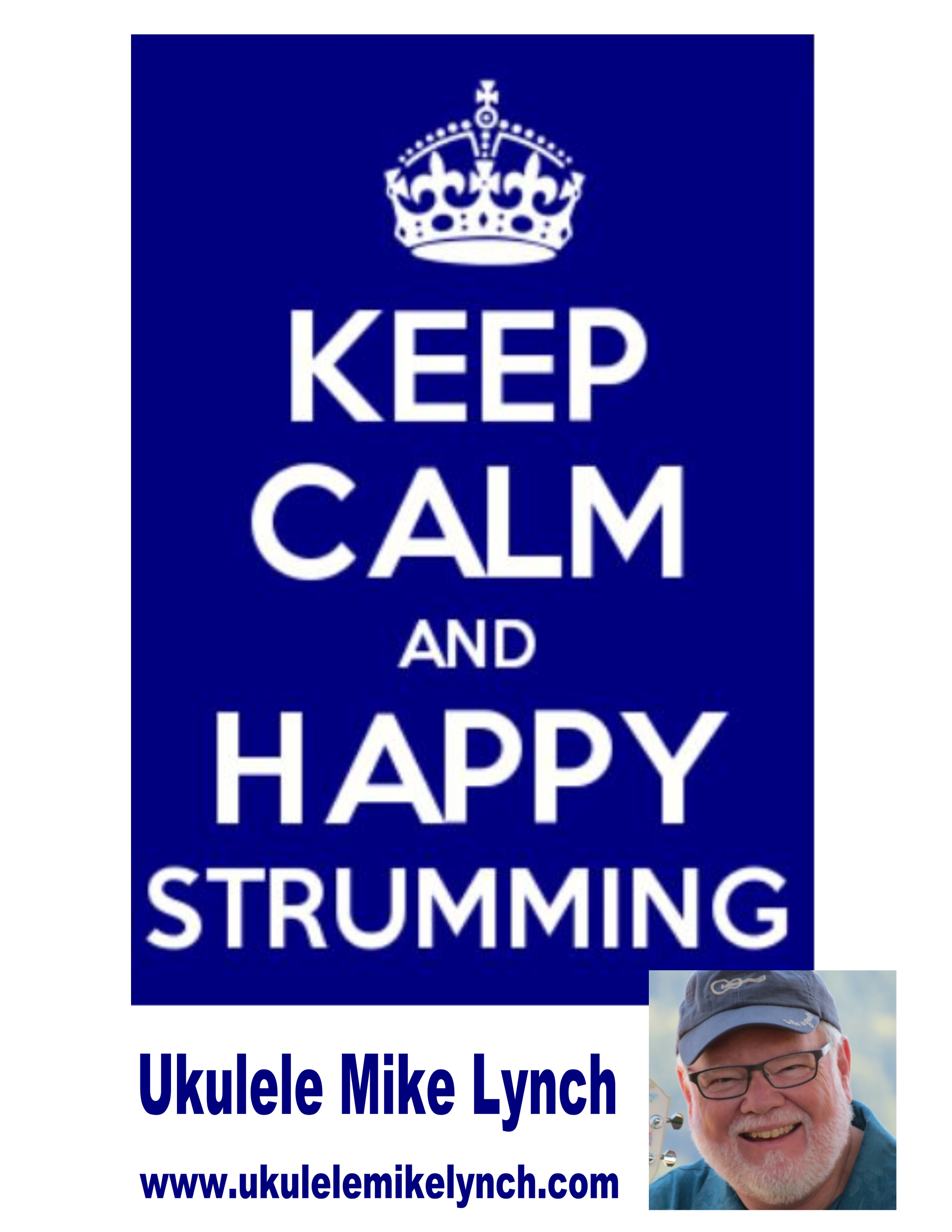 P.S. For $5.00 plus shipping you can receive an official Ukulele Mike Bookmark/Ukulele Essentials reference card (made of sturdy card stock) to slip in your uke case or gig bag. On the front is the “KEEP CALM AND HAPPY STRUMMING” logo as pictured above. On the back is a basic chord chart plus tuning and fingering references. For an additional $2.00 I will personally sign it just for you. Shipping is $2.50 in the US $4.25 outside the US