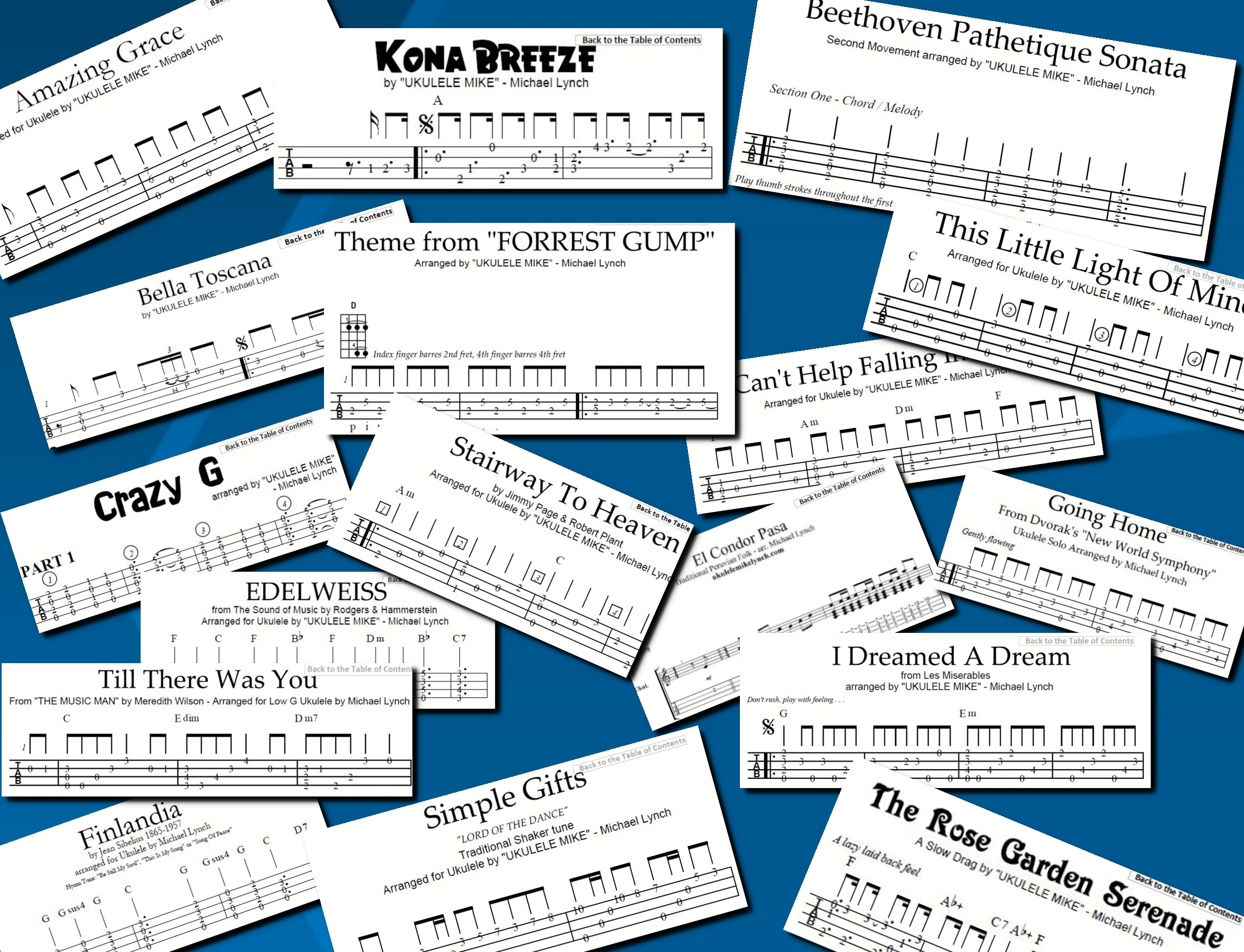All the pieces in this collection have been arranged by Mike Lynch Aka: Ukulele Mike and are formatted in tablature. The eBook is available for purchase for $28.95 and can be purchased by paying thru the PayPal donate button on the UKULELE MIKE website: http://www.ukulelemikelynch.com Once purchased it will be emailed to you within the day. If you have additional questions, don’t hesitate to ask Mike email: TheUkuleleMan2012@hotmail.com